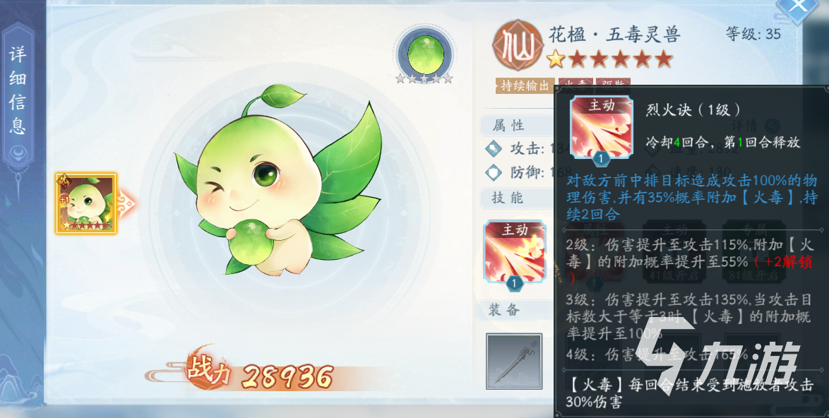 先来看一看花楹,花楹是有风火雷这三个属性的,通过详情可以看到火属性的花楹是拥有持续输出能力的,核心的输出技能也是对敌人前排和中排造成伤害的。这个技能就非常符合群体打击的一个设定,所以说花楹需要切换为火属性才行。