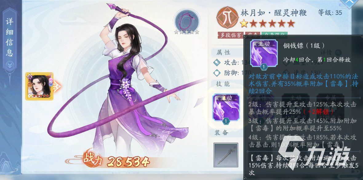 再来就是林月如,大家对于这个侠客还是比较了解的。本次战斗林月如是默认风属性的,而玩家要做的就是切换为雷属性的。雷属性的林月如输出技能也是针对敌人前排和中排的,同时在输出上拥有多段伤害的能力,输出量是比较充足的。