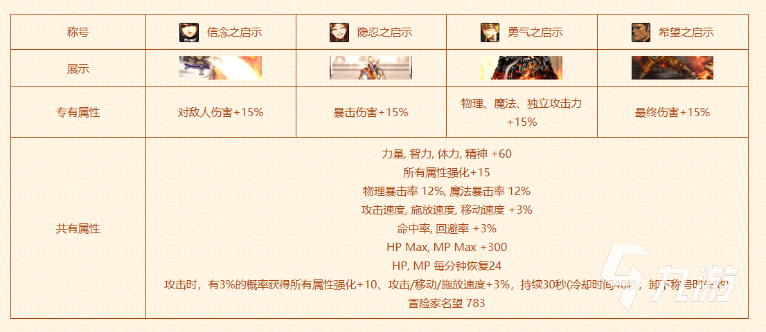 国庆称号有一共有四种。每种称号的基础属性都是一致的,所以要选的是它的特殊属性。一共有四种伤害词条属性可选,分别为黄字伤害,还有暴击伤害、三攻,以最终伤害这四种。 黄字伤害指的是固定伤害,适合红眼来打固定输出的职业。至于暴击伤害,适合打爆发性伤害的职业,例如武神。