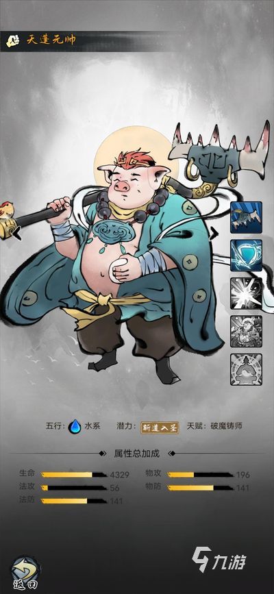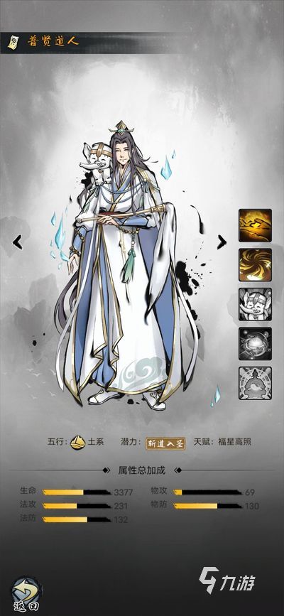 普贤道人在游戏中的建模上面背上有一个大白象,当然它的技能是与大象有关系的,作为一名土属性的仙友,它拥有的天赋是福星高照,根据他的技能面板,我们可以看出来,这是一个物理攻击极低的仙友,主要靠231点的法术攻击力来打伤害,其他的数值都是比较平均的,在游戏中也是担当符修的一名辅助。