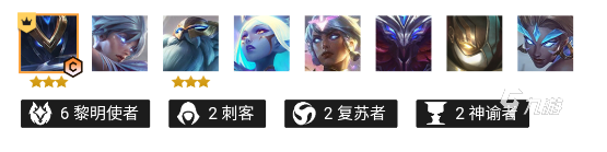 阵容组成;锐雯、酒桶、索拉卡、卡尔玛、艾翁、螳螂、派克、豹女。该阵容八人口成型,成型羁绊为六黎明使者两刺客两复苏者两神谕者。