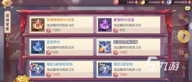活动宝库也是游戏的特殊玩法,玩家可以获得灵宠币,从而兑换稀有灵宠碎片、无双助力精选箱、橙宠碎片、三星稀有圣物等。