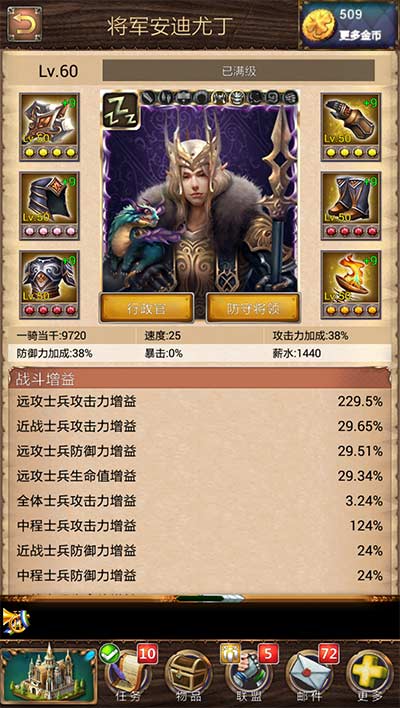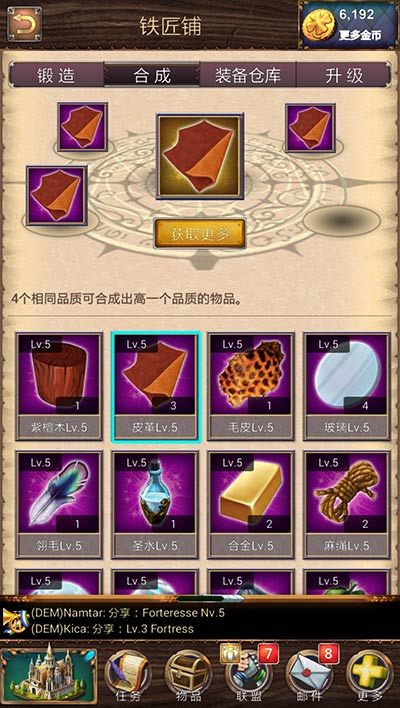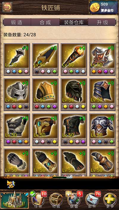 装备是提升部队战斗力的一个重要因素。打造一件装备需要3-4件材料。4件一样级别的材料可以合成一件高一等级的材料。装备分为1级,30级,40级,50级4个级别。其中50级装备有4个孔可以镶嵌宝石,30级、40级的有3个孔,1级的只有两个孔。装备除了镶嵌以外还可以强化,需要消耗一定的强化符石,不用担心坑钱,这款游戏的强化是100%成功的,而且材料也不贵,一点都不坑钱,然而属性的提升也是…好吧,其实就是好看用的,不要太在意~好好弄宝石去吧!