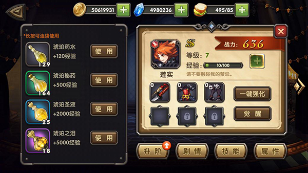 伙伴升级 – 使用经验药剂可以提升伙伴的等级,等级越高,进阶和觉醒后的差异就越明显
