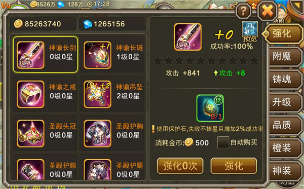 值得注意的是,即使是先把装备提升为神装,再提升品质等级的话,神装对品质提升的加成也是有效的,所以不用担心品质未达到最高就提升神装会吃亏哦~