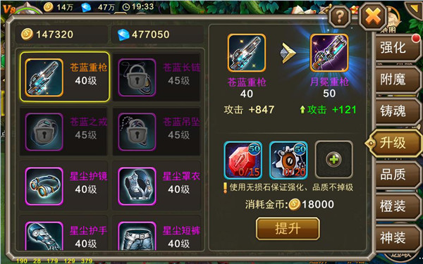 攻击套装和防具套装需要的升级材料不尽相同,攻击套装需要攻击魔石和机械零件,防具套装需要防御魔石和机械零件。此外,在升级为50或更高级的装备时需要注意,提升装备等级是有几率损失强化星级和品质等级的,最好备好对应等级的无损石才进行升级。