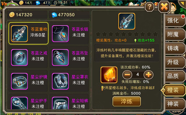 橙装是装备比较高级的追求,需要装备等级达到50级,以及消耗珍贵的星橙石。橙装后的装备基础属性得到大幅提升,同时还将额外增加一条属性。正如前文所说,升级和橙装是仅有的两个直接提升基础属性的系统。这意味着连同品质和神装提升的属性都会一并得到增幅!