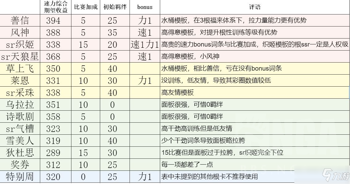 3.此外,由于比赛加成和初始羁绊也会影响根卡的推荐度,我也暂时没找到合适的量化标准,所以会列在表里一起供大家自行判断