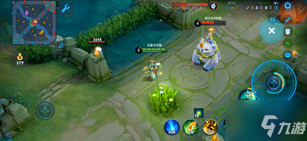 2技能:飞向指定方向的草丛,对周围的敌人造成伤害,对友军则回复血量。
