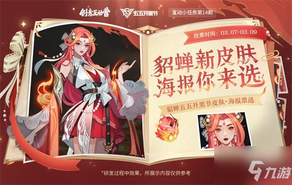 2、活动内容:玩家可从两版貂蝉五五开黑节皮肤的海报线稿方案中,选择心仪的方案投票,助力其成为最终游戏内海报。
