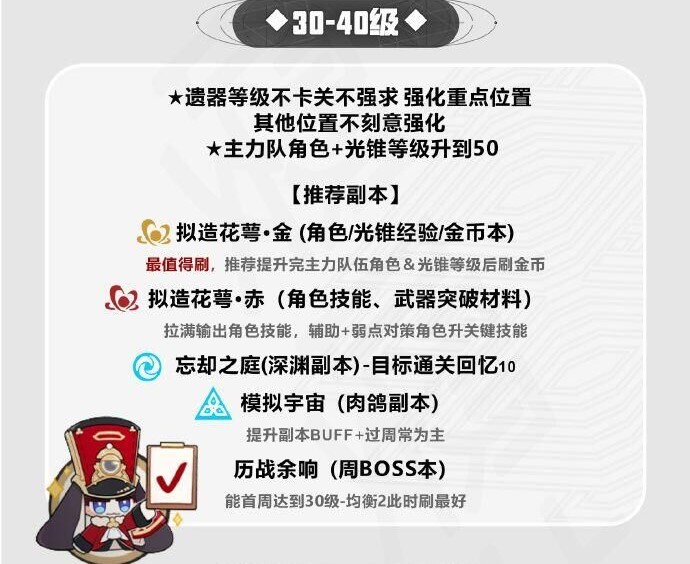 上面全部就是崩坏星穹铁道开荒体力规划30-40级建议,希望能为各位玩家们带来帮助,想要了解更多游戏攻略及资讯请持续关注九游。