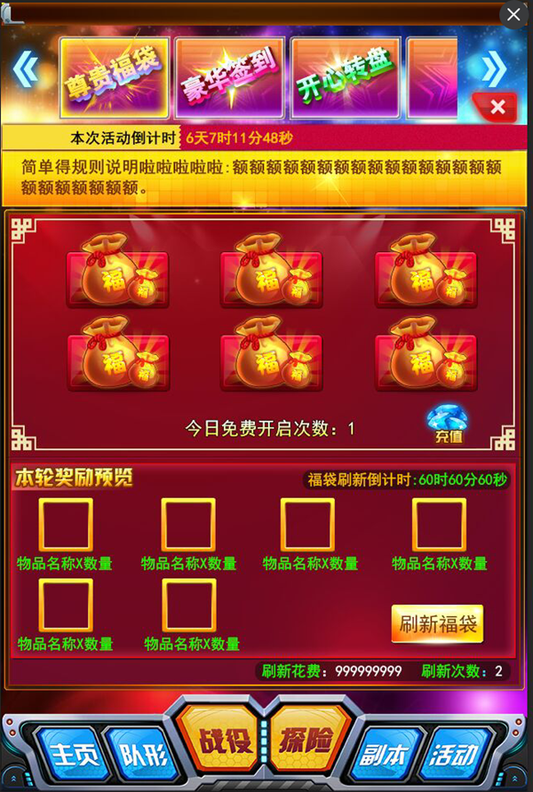 玩法介绍:每次刷新6个福袋,全部开启后一定可获得“本轮奖励预览”中的所有奖励!