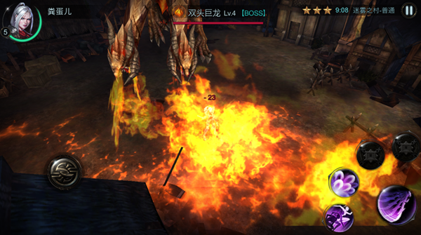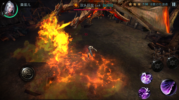 清完小怪后,小编再次来到boss面前,先没有急于出手,而是观察了一下boss的技能和走位,发现boss会几个技能:第一个是比较好躲掉的,朝玩家吐出2个火球,后面一个技能比较厉害,双头火龙先是飞到空中,然后冲着玩家俯冲,朝地面喷出大片火海,这时如果玩家躲避不及,被沾上一点点火的话就基本残血了(刚才小编就是没注意直接残血然后被boss一个QR2连带走)。所以玩家在面对boss这个技能的时候,最好在boss即将俯冲的时候利用游戏中的位移技能离开龙头俯冲的方向,即可轻松避过!