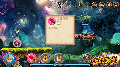特训塔第一层中需要我们利用二连穿心技能击倒两只史莱姆,这个技能是连续攻击两次,因此我们需要调整角度让两只史莱姆都处于抛物线轨道上,让两发攻击先后击倒他们。由于特训塔中所有攻击都是一击毙命,所以不用担心怪物血量的问题。