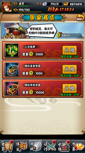 国家商店是使用「国家贡献」进行道具兑换的地方。可兑换的道具有:人兑换券、随机蓝装备宝箱、随机紫装宝箱。