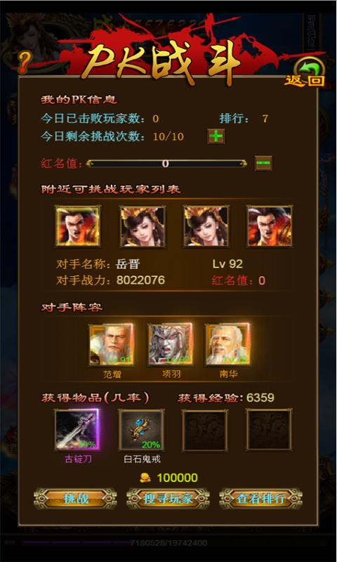 每个玩家每天有10次挑战次数,如果次数用完了,就要花元宝购买,所以尽量寻找可能挑战成功的玩家来挑战才可以获得最多的奖励。当然如果你也多余的元宝也可以试试购买挑战次数,因为挑战越多,越容易排上pk排行榜。
