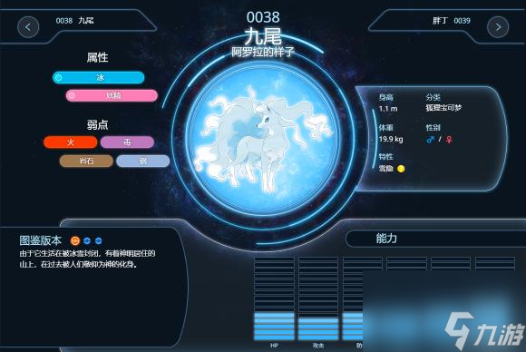 阿罗拉九尾居住在阿罗拉地区被奉为神圣之山的雪山上,会在暴风雪的伴随下出现。在被人知道是九尾的地区形态之前,人们一直把它敬为神的化身。据说它栖息的山中会有神仙来访,所以过去是禁止上山的。