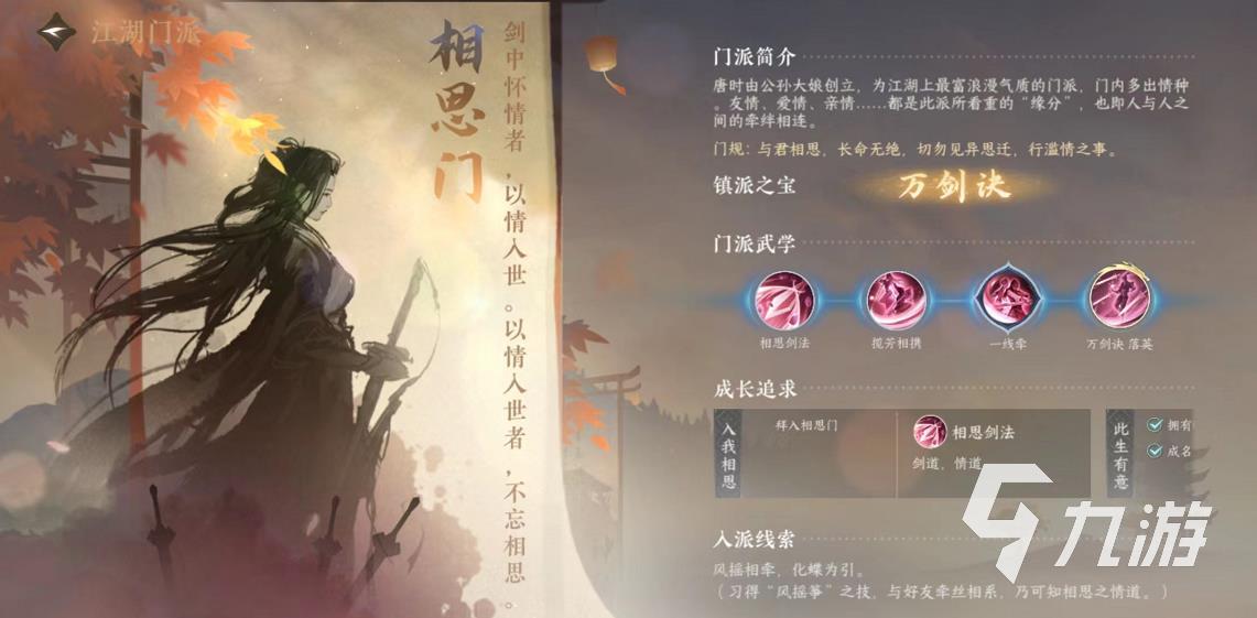 相思门派以浪漫、平和、友善为门派的中心思想,加入此门派的玩家,都以缘分为主,在特定的地点需要玩家做指定的动作方可加入,加入门派后可以让自己的情感得到更大化的重视,并且可以独门剑法。
