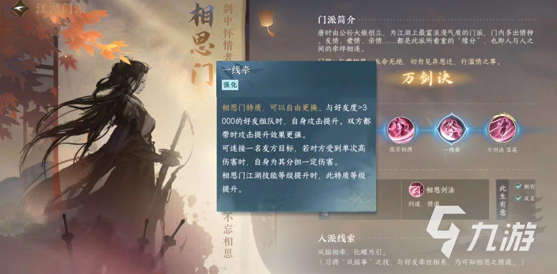 一线牵是相思门特有技能,该技能可以自由更换与好友度>3000的好友组队时,自身攻击提升,并且双方都带时攻击提升效果更强。在使用时可连接一名友方目标,若对方受到单次伤害时,玩家将自身为其分担一定伤害。