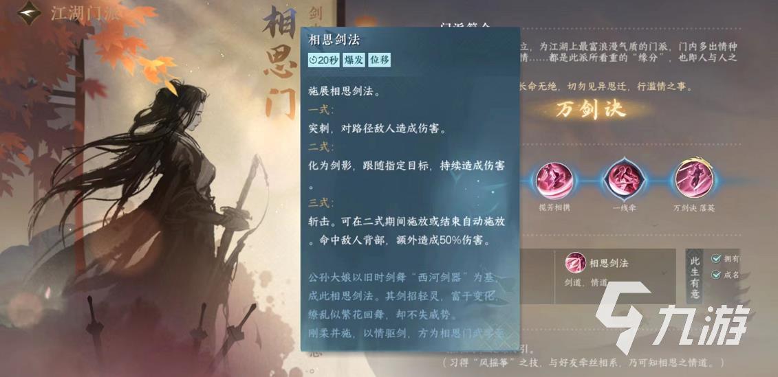 相思剑法分为三个招式第一步向前出剑,并对路径敌人造成伤害。接下来将化为剑影,跟随指定目标持续造成伤害。最后一步可在二式期间施放或结束自动施放命中敌方背部,将会额外造成50%伤害。
