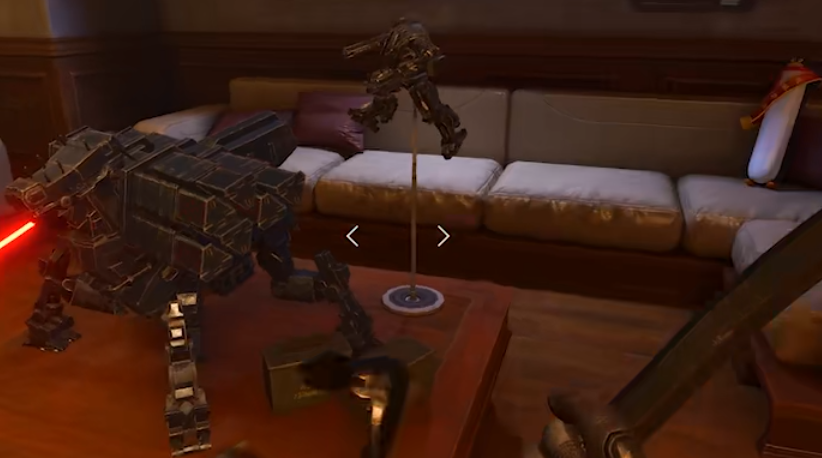 茶几桌子上还有南十字与机甲,旁边的留声机还能播放老逆战大厅的经典背景音乐。场景中还有3个问号,触碰可以得到一些猎场金币。旁边的饮料机是可以敲打的,多打几次会爆金币。还有游戏机里面的画面是端游的大都会,里面角色持有的实“灭烬之嗣”,端游的一把免费武器。