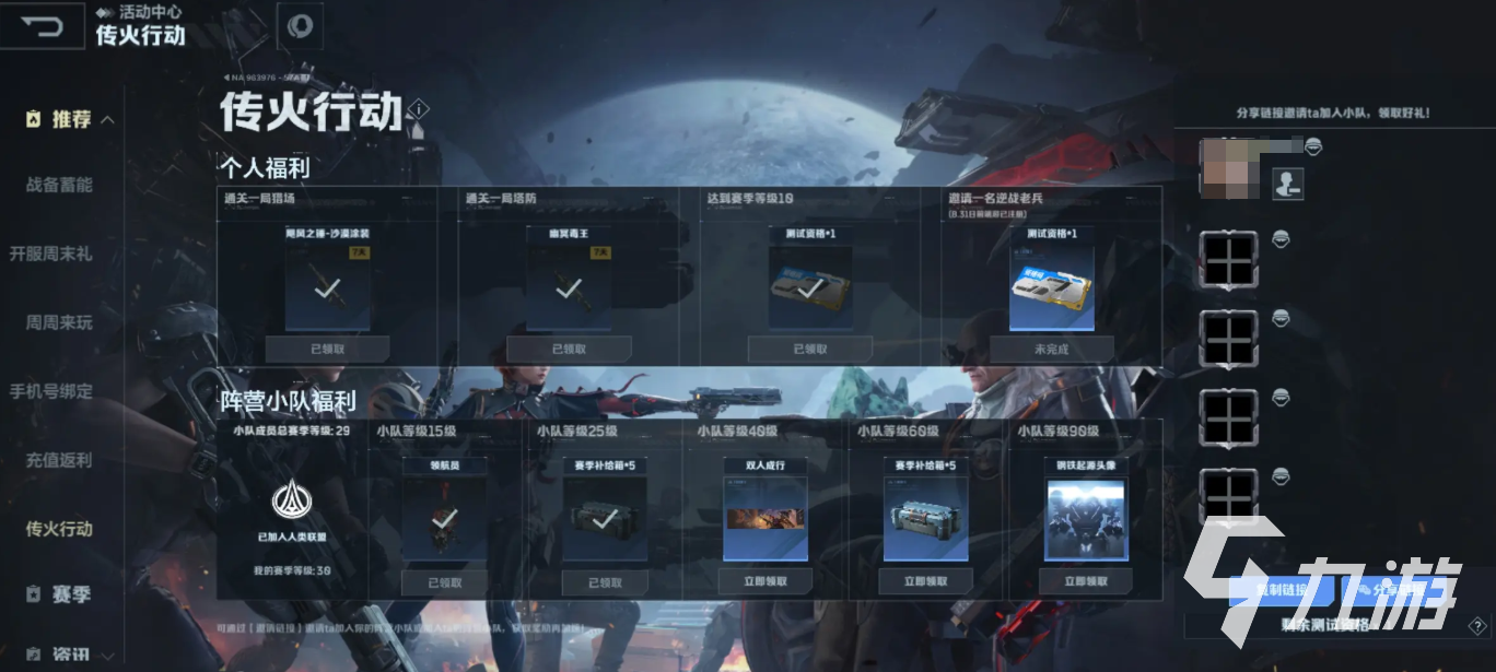 至于传火,这个是已有资格的玩家分享的,在活动中心里有一个“传火活动”,分为个人福利和阵营小队福利。个人福利中有通关一局猎场、一次塔防、达到赛季等级10级、邀请一名逆战老兵这四个指标。