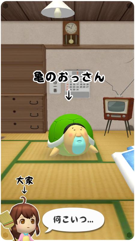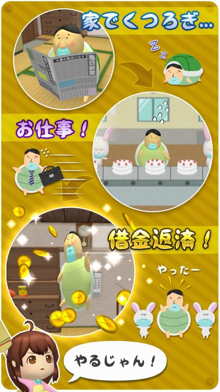 とある風呂なし木造アパートにカメのおじさんが住んでおりました。 そのおじさんは定職にもつかず、お金はありませんでしたが、悠々自適な毎日を過ごしておりました。 ただ、おじさんは事ある毎にウサギの知人からお金をせがまれるのでした。 そして、おじさんはそれを断ることができなかったのです。 そう…借金をしてまでも… …そんなおじさんを人々はこう呼びました。 「おひとよしカメたろう」 ========================================= ■借金返済ゲーム? ちょっとお金に困ったウサギたちがひっきりなしにやってくる! 優しいおじさんなら、自分が借金してでも、お金を工面してあげようね! 借金したなら働いて返せ!社会の道理って厳しいね! やっと借金返済! …でもまたウサギが来ちゃうかも!? ■コレクション要素! おじさんの部屋のインテリアは模様替え可能! インテリアをゲットしたら自分好みの部屋にしよう! おじさんの着せ替えもできちゃう!? これは現代版ウサギとカメ!? 今すぐアプリをダウンロードしてみよう! [1.0.5] ・家具/スーツのボーナス効果を追加 ・ストーリー進行中の「AUTO」ボタン(画面左上)機能を追加 ・一部表示修正 ・その他細かなバグ修正 [1.0.4] ・細かなバグ修正 [1.0.3] ・一部表示修正