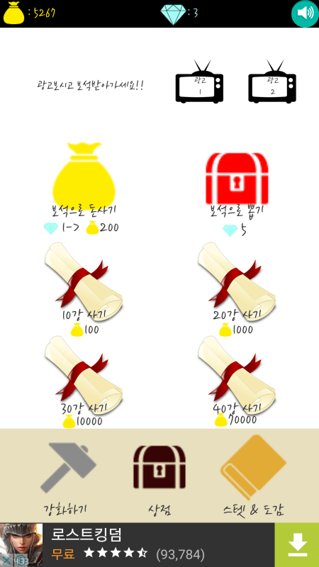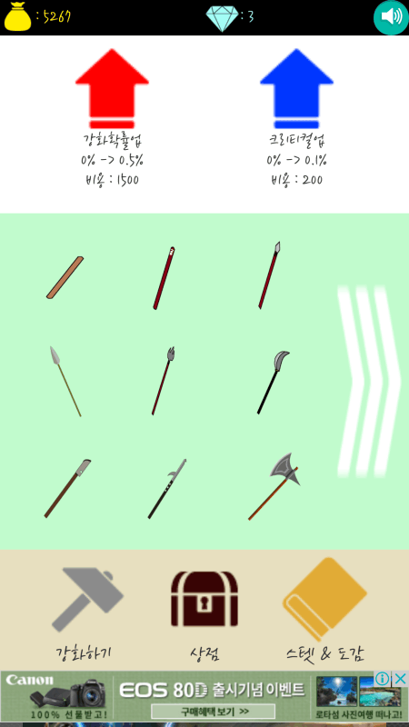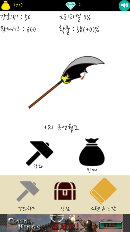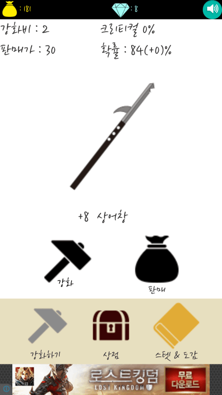 창을 강화해서 돈을 벌고 스텟을 올려서 더 높은창에 도전하세요!!!!도감을 채워가는 재미를 즐겨보세요!! 남녀노소 누구나 간단히 즐길 수 있는 킬링타임 게임 정교한 컨트롤도 필요없고 오로지 당신의 운에 달려있습니다. 아 그리고, 크리티컬이 발생하면 창이 두 단계 올른답니다 최고의 대장장...