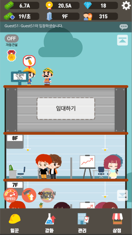 건물 키우기는 세계에서 가장 높은 빌딩을 만드는 게임이에요. 부르즈 할리파보다 더 높은 랜드마크 건설을 목표로 일꾼을 모아주세요. 건물 매각을 통해서 산업훈장을 얻고, 더 빠르게 새로운 건물을 건설해주세요. 편의점, 카페, 병원 등 상가를 임대하고 더 많은 건설자금을 확보해주세요. --...