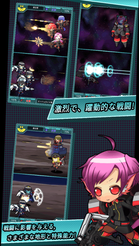 新概念のミリタリーSFカジュアルの戦略シミュレーションゲーム! 様々な兵科とのユニットを戦略的に生産して配置して、敵を撃破して惑星を占領してください! 1. 躍動的な戦闘シーン - 両陣営ユニットが同時にやり取りする数多くの砲火! - 派手なエフェクトや多様な攻撃モーション! - いろんな変数による、毎度違う戦闘シーン! 2. 魅力的なキャラクター - 人間、獣人の、エルフとメカニックで構成された個性的なユニット! - 様々な火器と機甲兵器の運用! - キャラクターの具体的な話や、特殊能力! 3. 多様な戦略性 - 資源の管理とユニットの生産! - 方式を通じたユニット配置の変数提供! - ユニットの能力値と特殊能力を通じた相性発生! - 敵惑星の占領と味方惑星の防衛! 4. 付加的な楽しみ - ユニットレベルを通じた成長要素存在! - 新規ユニットを研究して、段階別に開発していく達成感! - ユニット情報や歴史など様々な情報を閲覧!