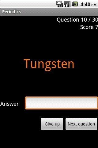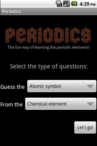 The fun way of learning the periodic elements!A great and simple game for mastering the names, symbols and atomic numbers of all known elements in the periodic table. Learn everything from hydrogen (H) to ununoctium (Uuo).Select from one of the six different game types, and try to take on the quest for a full highscore!Don't miss to try out the sudden death mode and see for how long you can survive the thrilling challenge!