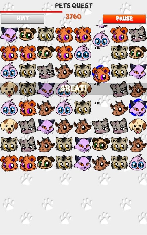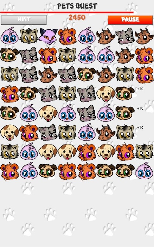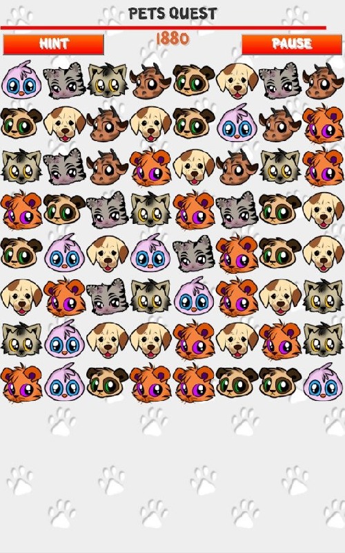 Pets Quest is type of match-3 game.The rules are simple:Swap adjacent pets to make set of 3,4 or 5. Bigger sets makes bigger bonuses like line and row clearing, 3x3 area clearing, etc..But watch out your time is limited. If you are lost you can use Hint button. it shows you one possible solution. Be prudent, you can use this help only once per minute.