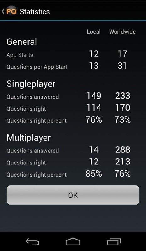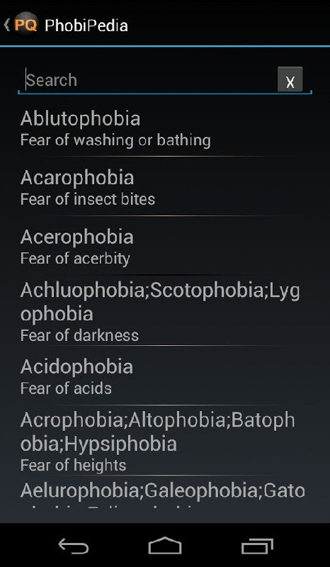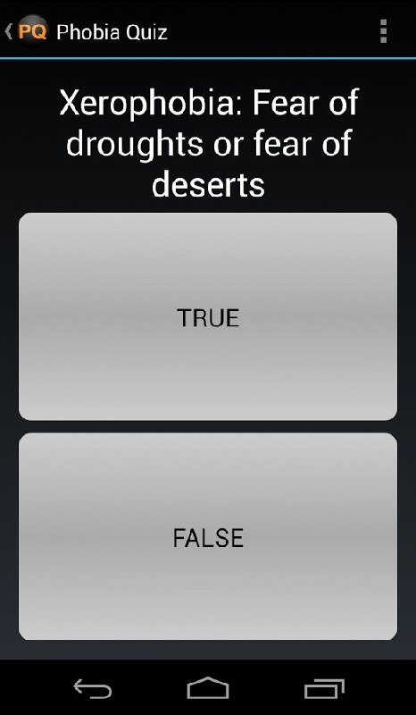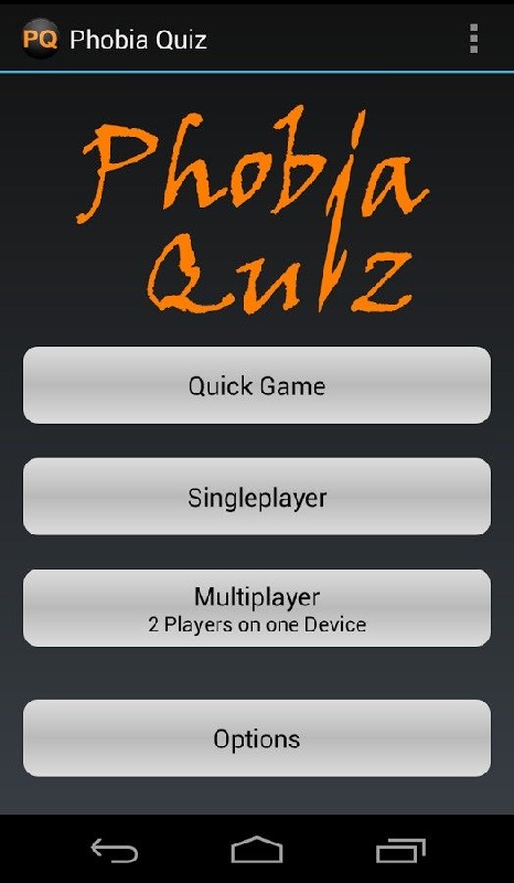 PhobiaQuiz is a trivia game in which the technical tearms of various fears have to be identified and correctly linked to their descriptions. One of two answers is chosen by pressing the respective button. Afterwards the correctness of the answer is shown.In Multiplayer mode two players share one device. The player to first hit the right answer will get the point. If the answer was incorrect, the opponent gets a point. Whoever hits the score limit first, wins the match.Over 400 phobias are already waiting to be recognized and linked with their descriptions. The phobias range from fear of vegetables over fear of Friday the 13th to the naked mole rat-phobia.