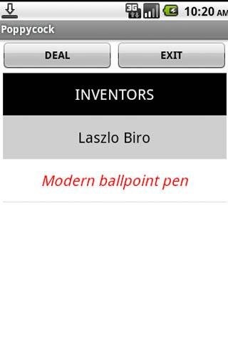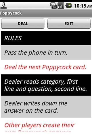 Bluffing and Trivia card game for those that love party games like Cranium, Charades, Apples to Apples, Trivial Pursuit, Balderdash, Pictionary, Scrabble, Boogle, Scene-it, or Taboopoppycock [pop-ee-kok] Definition: nonsenseSynonyms: babble, balderdash, baloney, bull, bunk, drivel, empty talk, foolery, foolishness, gibberish, hogwash, hooey, hot air, jive, malarkey, mumbo jumbo, palaver, prattle, rubbish, silliness, trash4000 trivia cards in 5 categories.WORDS - Write the meaning of an obscure word.HISTORY - What happened on that day?ACRONYMS - Whats does this acronym mean?FILMS - Write a one line plot for the film.INVENTORS - What did they invent or discover?Similar board games cost 30 times more !!!Ideal for dinner parties or Christmas. As many players as you want.RULESPass the phone in turn.Deal the next Poppycock card.Dealer reads category, first line and question, second line.Dealer writes down the answer on the card.Other players create their own Poppycock answers.Dealer reads out all the answers.Each player guesses the answer on the card.Players gets 1 point for each guess for their Poppycock answer.Players gets 1 extra point if they write down the answer on the card.Dealer gets 1 points if no one guesses the answer on the card.First Player to 20 points wins or score the points on a Snakes and Ladders board.Size this board to A4 (http://xyz.frig.me/nnj), print and play using prizes from your Christmas Crackers, buttons or coins.
