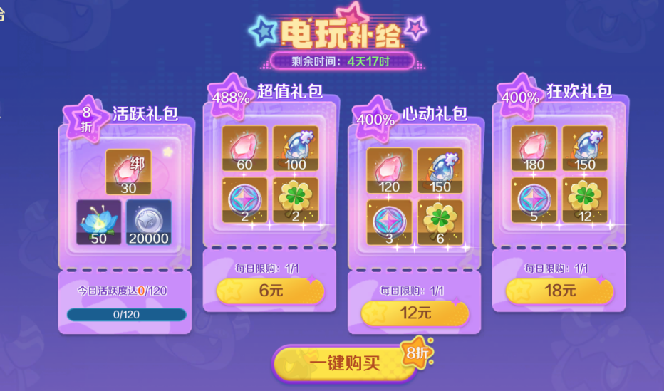 活动规则:活动期间,只需每日活跃达到120点,或选择直接花费6元、12元、18元即可购买超值特惠礼包。更棒的是,选择“一键购买”还可享受8折优惠!奖励次数将于跨天凌晨5点刷新,切勿错过。