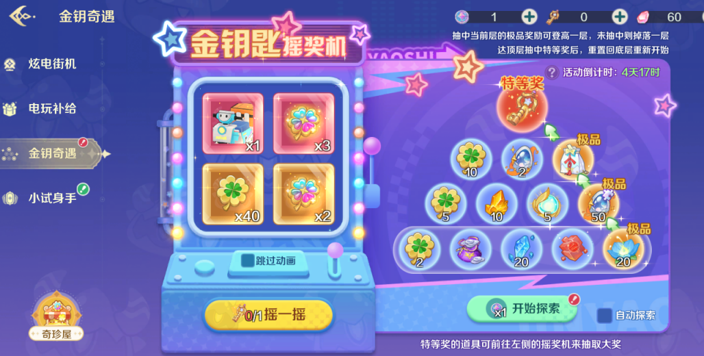 活动期间,使用道具:电玩币,即可参与金钥奇遇活动,当抽中当前层的极品奖励可登高一层,未抽中则掉落一层,达顶层抽中特等奖后,重置回底层重新开始。旅人们获得特等奖:金钥匙后,可以前往活动摇奖界面,摇取珍稀大奖 ,这里有限定坐骑【宅急送-碰碰】,【虹光水晶】,【幸运草】,快来试试运气吧。