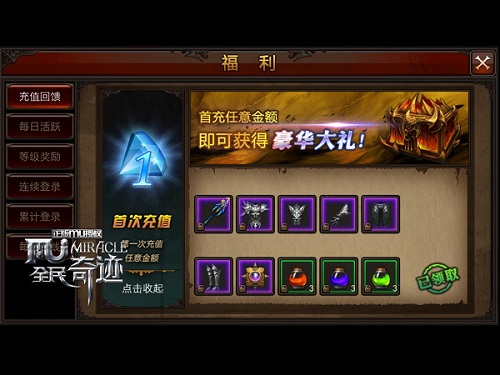 首冲礼包物超所值,幸运武器拱手奉上其实,在《全民奇迹MU》中,还有一条获取幸运武器的捷径,那就是新玩家首次充值。在首冲大礼包中,不仅有着一整套二阶传说紫装和三套属性药水,最最重要的是,能够获得一把+7强化等级的幸运属性四阶武器,这把武器,可以说是整个游戏中由始至终武器培养的基础与核心!而这一切,只需要完成6元的最低充值额度一次即可免费获取!称王之路,由此开始!