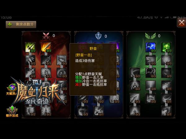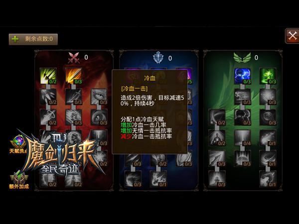 但对于《全民奇迹MU》这个具体的游戏来说,却有着绝对的选择!在目前的版本中,由于每个职业都有一个自带BUFF,已经极大的弥补了自身的职业短板,因此在天赋树这样的后期个性化系统中,选择扬长避短,将自身的职业优势更大的发挥出来,才能够获得更好的战斗效果。总的来说,弓手野蛮,法师冷血,战士无情,魔剑随心,能够基本保证大伙儿从天赋系统中获取不菲的战斗实效。