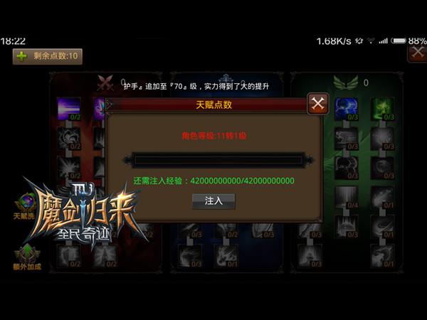 天赋树上天赋点数的获得,并非是根据等级自动生成,而是要玩家朋友们用自己辛苦积攒下来的经验值来换取,通过注入当前经验条中的经验值,来生成共计10点天赋点数。这样一来,等级提升与天赋加点的矛盾便不可避免的存在着,如何取舍10转后等级提升带来的收益与天赋加点获取的战斗实力,成为了最关键的地方。