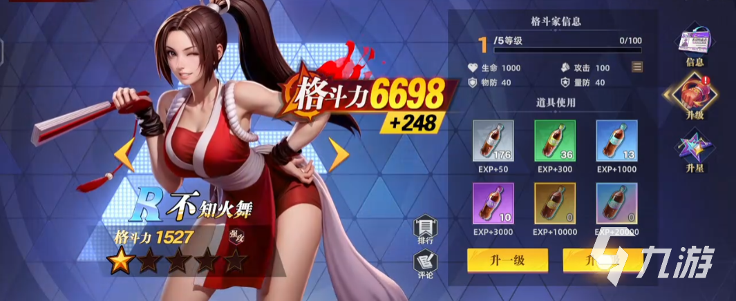 不知火舞是攻击型格斗家,初始就具有曝气效果,这种状态能维持2轮,有30%几率对全体敌方添加“妩媚”效果,可降低敌方防御力,战斗初始阶段就让她具备一定优势。怒气技“超必杀忍蜂”,优先攻击敌方生命值最低的3个敌人,在曝气状态之下, 能额外提升15%最终伤害;这个招式比较适合用来清理残血对手,在战斗初期能建立优势,且斗魂系统能给到600点初始怒气,使她能更快速度放出关键招式。