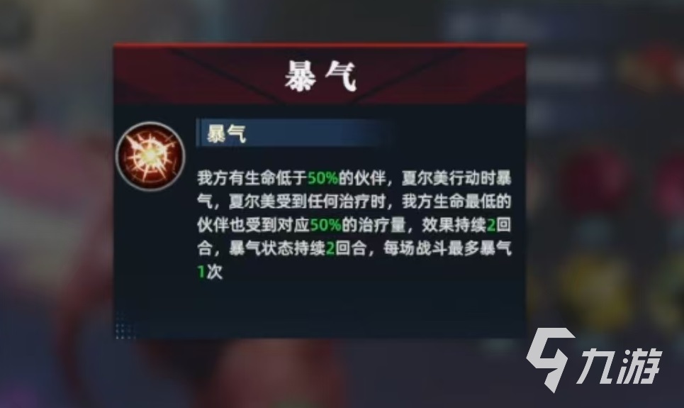 夏尔美的必杀技能是攻击对方单体目标,在造成物理伤害后,有60%的几率附加诱惑效果。对方在被成功诱惑后,使用普通攻击伤害我方伙伴,会降低其20%的普攻伤害,持续两个回合。如果必杀技处于爆气的强化状态下,那么将对敌方全体目标有40%的几率造成诱惑。这样的技能效果伤害尚在其次,但是削弱对方全体的普攻伤害,对于增强我方的生存能力非常有效,而且触发的几率并不算低。怒气技能效果是攻击对方单体目标,并恢复自身20%的最大生命值。在爆气的强化下,额外提高8%的最终免伤。对于一个坦克来说,恢复血量和增加免伤,都是非常有效的生存提升效果,使得夏尔美能够扛住更多的伤害。
