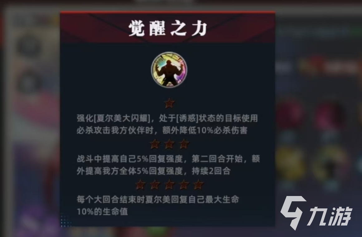 每当我方有生命值低于50%的伙伴时,夏尔美在行动时就能触发爆气,夏尔美受到任何治疗,我方生命最低的单目标也可以获得治疗量。在被动技能的影响下,夏尔美的强化重拳还可以提升我方全体的最终免伤效果,当叠加到三层之后,有6%的最终免伤属性加成,也是一个很有用的生存类型被动。在觉醒之后,强化之后的必杀技使得处于诱惑状态的目标,额外降低必杀伤害。在战斗中提升自身的回复强度,额外提升我方全体回复强度,以及在大回合结束后,夏尔美可以恢复生命值。
