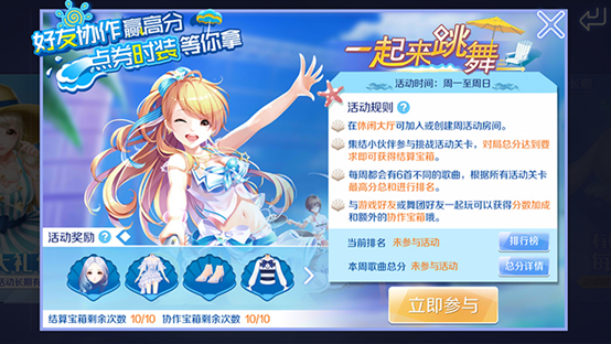 一起来跳舞:这是一个需要协作挑战歌曲的活动,在休闲大厅中与小伙伴们挑战歌曲的总分达到要求后,就可以获得宝箱奖励,可以领取到各种服饰的碎片,通过工坊的服饰合成就可以获得对应的服饰。