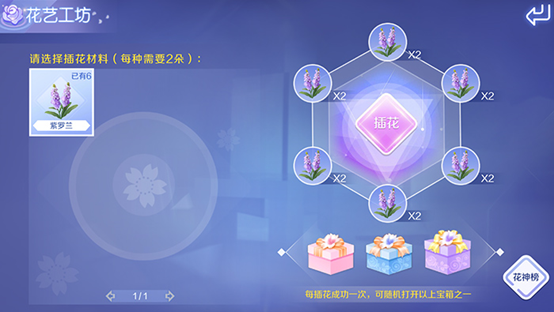 花艺工坊:玩家在秘密花园中通过种植鲜花,可以获得对应的成品鲜花,然后进入到花艺工坊后使用12朵鲜花可以进行插花。每次成功插花后,就可以随机打开其中的一个宝箱,宝箱中就包含了一些服饰奖励。