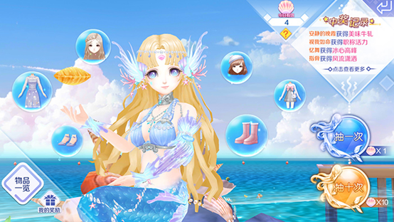 美人鱼祈愿:美人鱼祈愿是社区中的核心玩法,玩家通过钓鱼、答题、挖宝都可以获得七彩贝壳,然后就可以去美人鱼处参与道具抽取,通过抽取就有机会获得服饰奖励。这里推荐大家积累10个道具后,直接参与10连抽,这样获取到服饰奖励概率会提升哦!