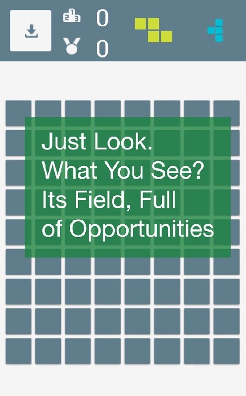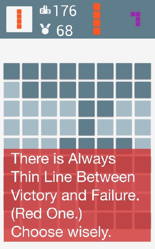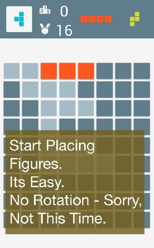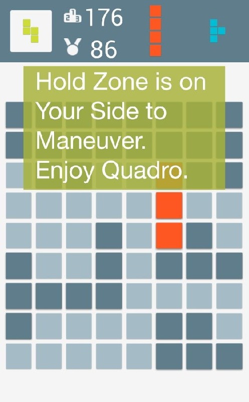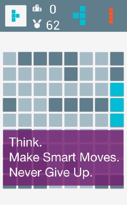 Quadro - the game for those who enjoys thinking. It is best suitable for long underground trips, traffic, after launch, before sleeping. It is a mix of classical match3 gameplay and more classical tertis. game.Game rules:Draw quadro-figures on the field, remove rows, get score.Hold zone is for experts in thinking.Get combo for the sequence of removed rows.Almost forgot. Figures are not rotating. It would be pretty simple if they are.