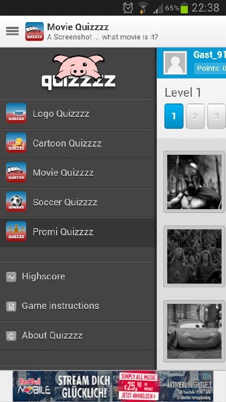 quizzzz is a simple quiz game where images need to be recognized.Currently there are 5 categories:- Logo Quizzzz- Cartoon Quizzzz- Movie Quizzzz- Soccer Quizzzz- Celebtrity QuizzzzThe game is played over several levels with 15 images. If 12 images correctly identified, the next level is unlocked. For every action points are awarded. Player with the highest number of points will be listed in the Higscoreliste.If you do not recognize a picture, you can also use a joker. In each level you get new 3 joker.Originally quizzzz was developed as an online browser game for the PC. With this app you can now play Quizzzz on Android devices. The same database is used. Registered players can thus play on different devices with the same account.quizzzz can be played only with active internet connection!More functions and all game modes provides the browser version: quizzzz.net