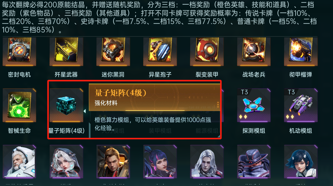 依然可以抽取经验药剂、原能结晶和量子矩阵,用于提升装备等级、英雄等级、技能等级等,提升战斗力,爆率与常驻卡池无异。注意该卡池还会产出4星量子矩阵,能大幅提升装备等级。