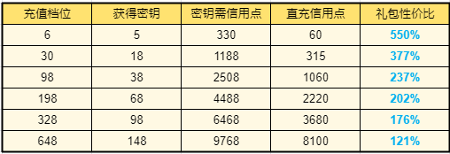 以下为各个梯度的超值礼包对比直充的性价比,可供参考。可发现在档位较低时性价比极高,尤其是198以前的档位,性价比均超过200%,非常推荐购买。