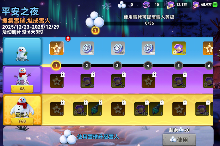 3、所有玩家投掷雪人都会使雪人成长而升级,每次升级,全服玩家都可以领取对应的等级奖励。